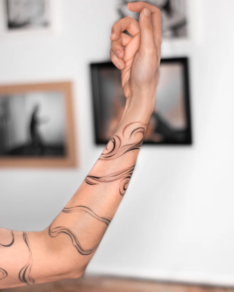 - Diseños lineales abstractos que recorren brazos, piernas o espalda